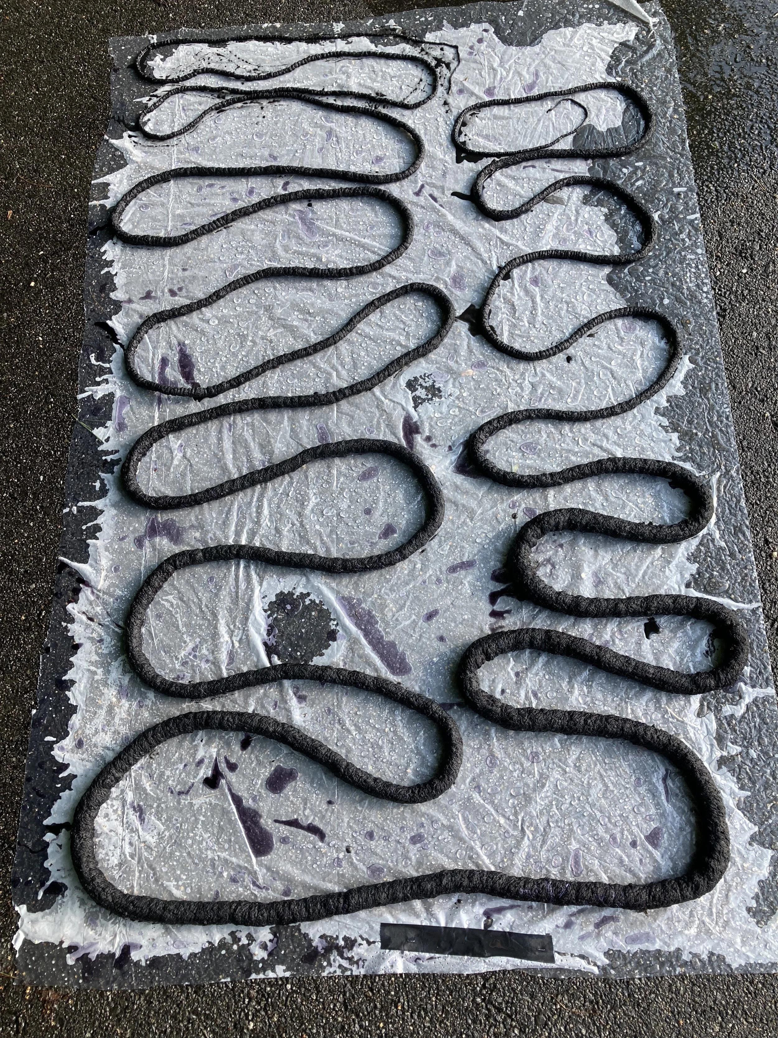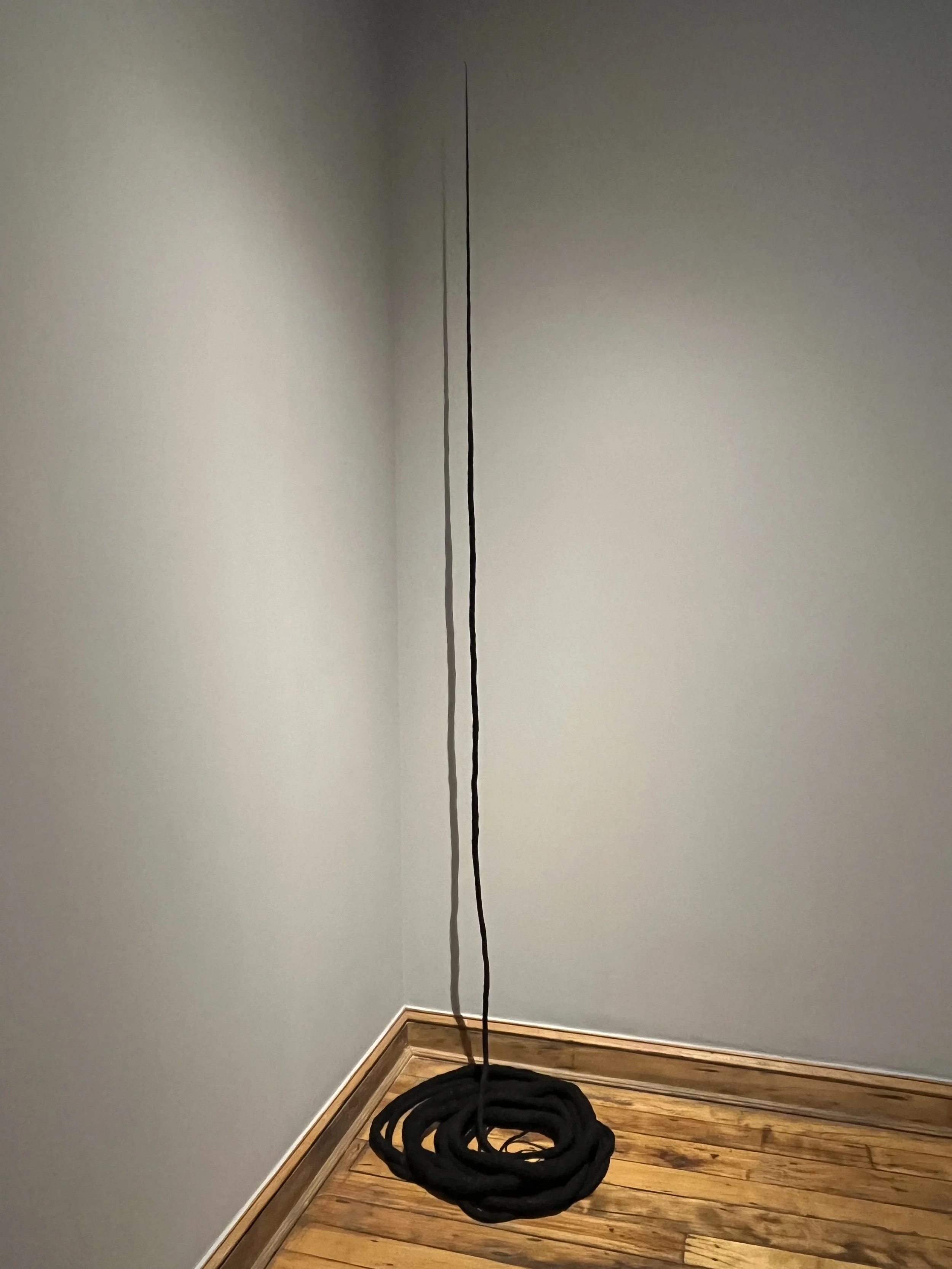 Dividing Line, Cotton string, cotton and polyester thread, bed sheets, black dye, 57’, 2017- 2021